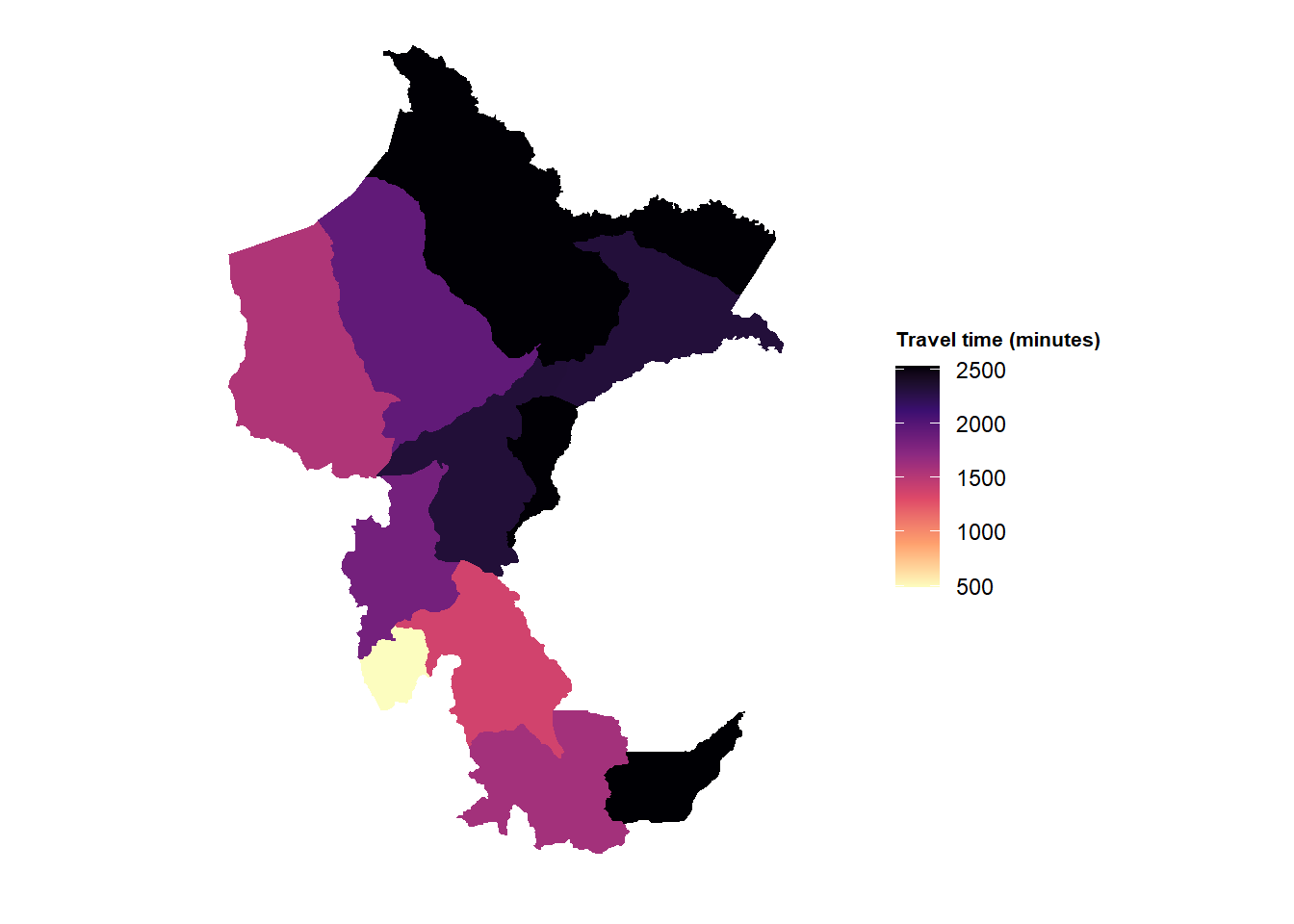 Visualize the relationship between association between malaria incidence count, temperature, forest loss, and travel time to health centers across the Peruvian Amazon