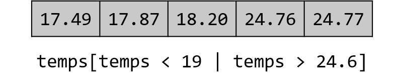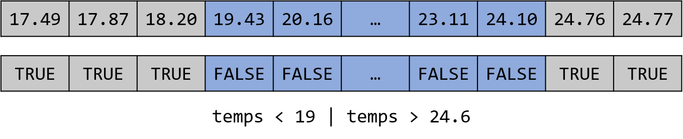Por ejemplo, si definimos que las temperaturas menores a 19 C° son valores atípicos, necesitamos comparar cada elemento de temps con este umbral: